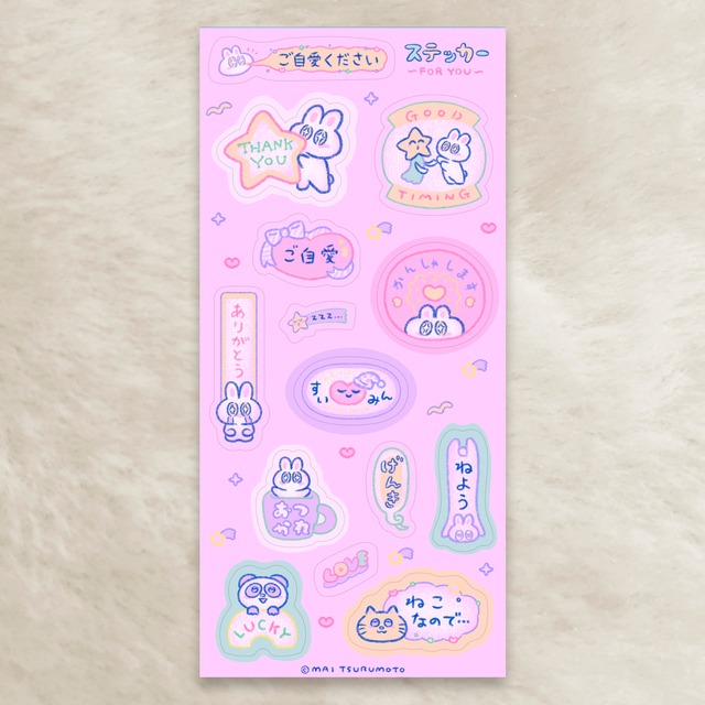 ぜひ自分に使ってほしい「ご自愛ください」ステッカーです。 アニマルたちの労り&ハッピーな言葉をあなたに。 光沢のないややマットな紙質です。 ◼︎サイズ 縦148mm × 横70mm